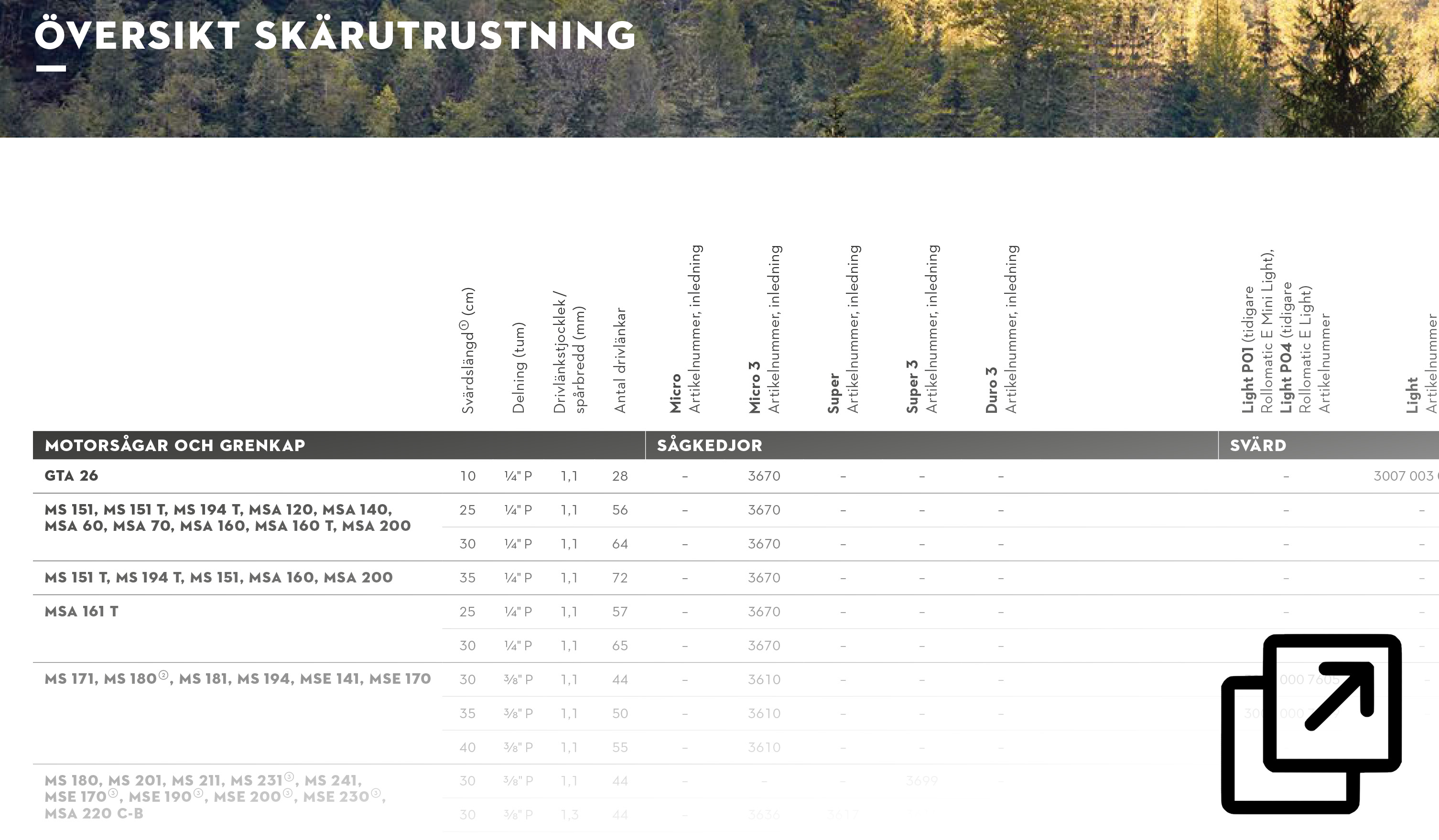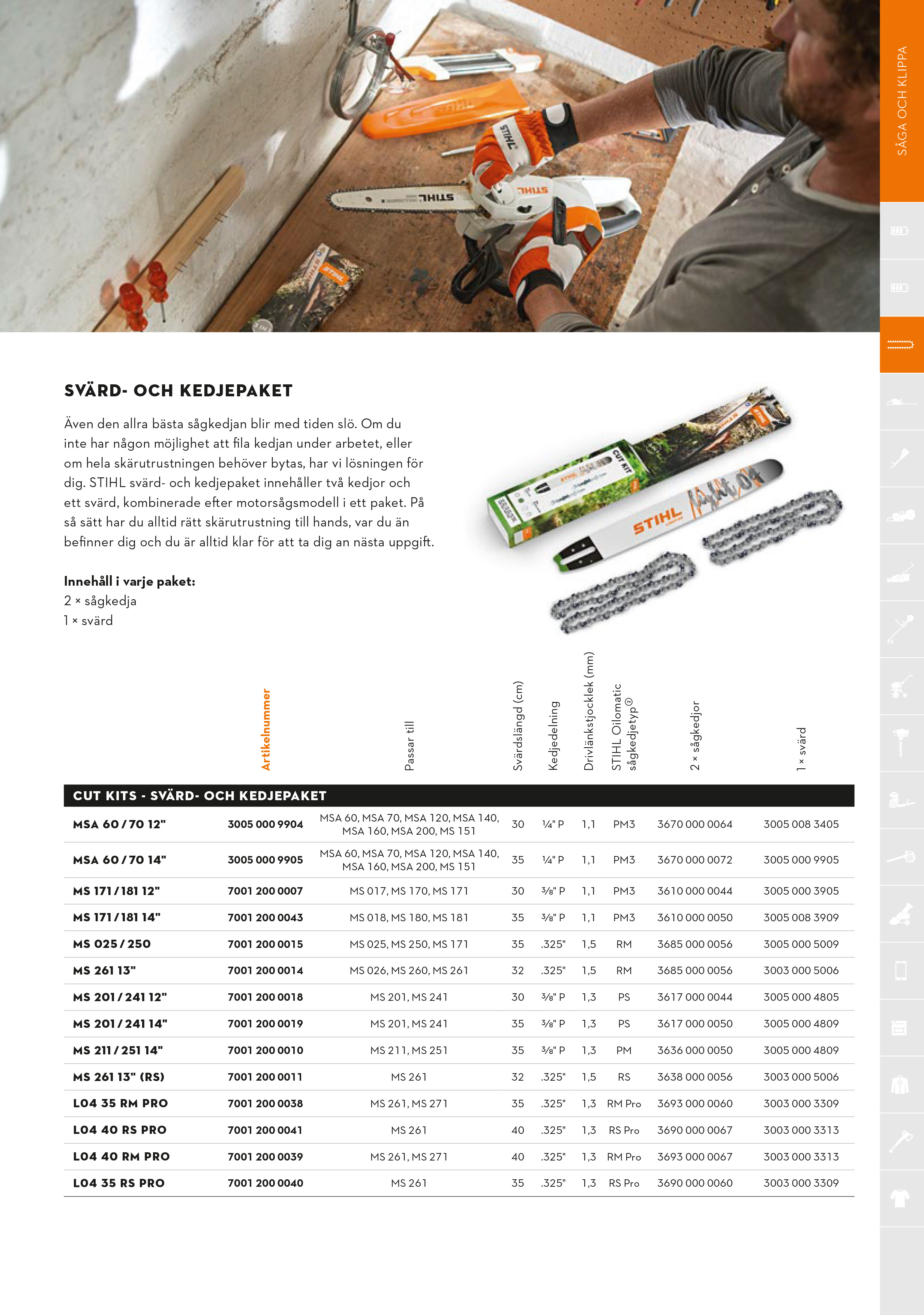 För att din motorsåg ska prestera på bästa sätt är det viktigt att använda rätt svärd och kedja. Här hittar du två praktiska tabeller från Stihl: en som visar vilka svärd och kedjor som passar olika motorsågar, och en översikt över skärutrustning för att snabbt hitta rätt svärd till din maskin.