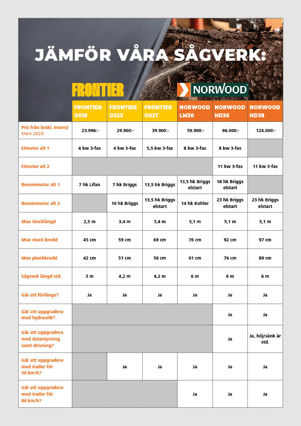 Vi på Skogma är stolta återförsäljare av Norwood- och Frontier-sågverk, världsledande inom transportabla sågverk.