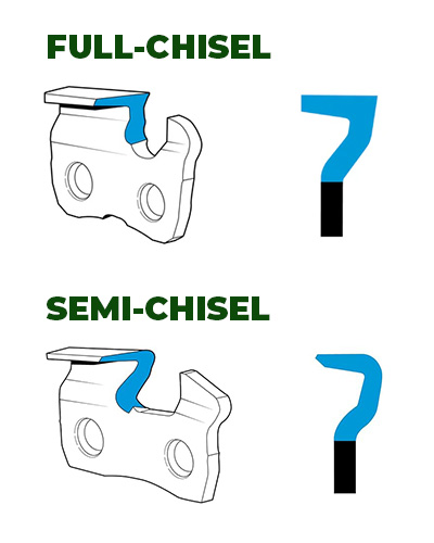 Sågkedjor som heter full-chisel, eller enbart chisel, har vassa hörn som effektivt delar träfibrer. De sågar snabbast och effektivast i mjuka träslag och de går att få en bättre skärpa på de i jämförelse med semi-chisel kedjor men däremot är de inte lika hållbar. Man får helt enkelt fila lite oftare och kedjan kallas även ibland för fullmejsel. Exempel på kedja i vårt sortiment är 8703833473.