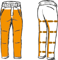 Byxorna är den mest centrala delen i din sågskyddsutrustning. De skyddar benen – den del av kroppen som löper störst risk för skador vid arbete med motorsåg. Sågskyddsbyxor finns i klass 1–3 beroende på skyddsnivå. Både EN 381-5 och EN ISO 11393-2 anger tre typer av benskydd.