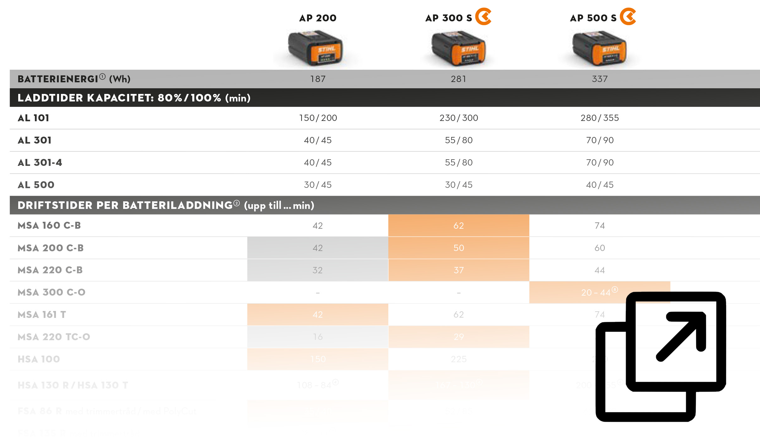 Här ser du exempel på hur länge du kan arbeta med en laddning beroende på vilken maskin och vilket batteri du använder. Tiderna är ungefärliga och kan variera beroende på arbetsförhållanden.