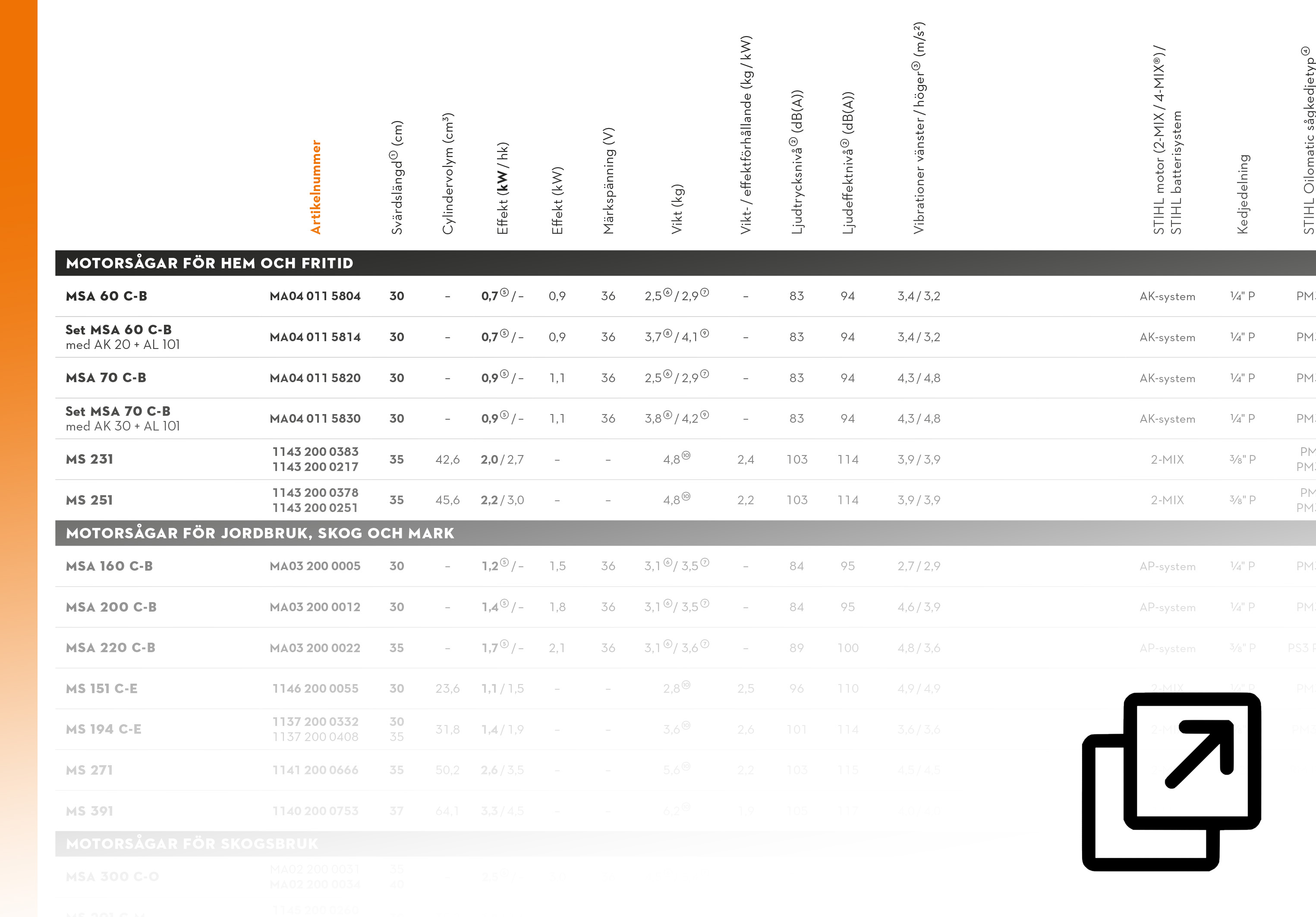 Se och jämför Stihls alla modeller i tabellen nedan.